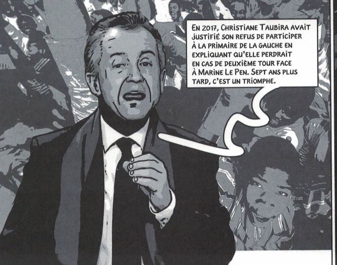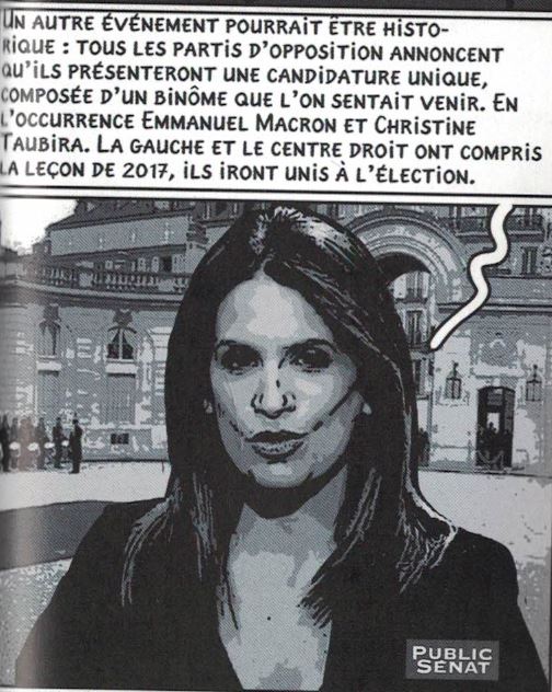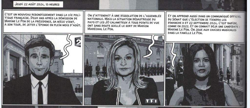 On ne sait pas comment sont départagés Macron et Taubira, mais, pages 82 et 83, c’est le premier qui affronte Marine la Pen le 3 septembre 2024. Et il lui dit des choses dont on se demande comment il pourrait les dire aujourd’hui sans faire rire tout le monde.