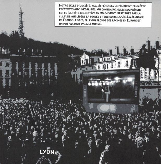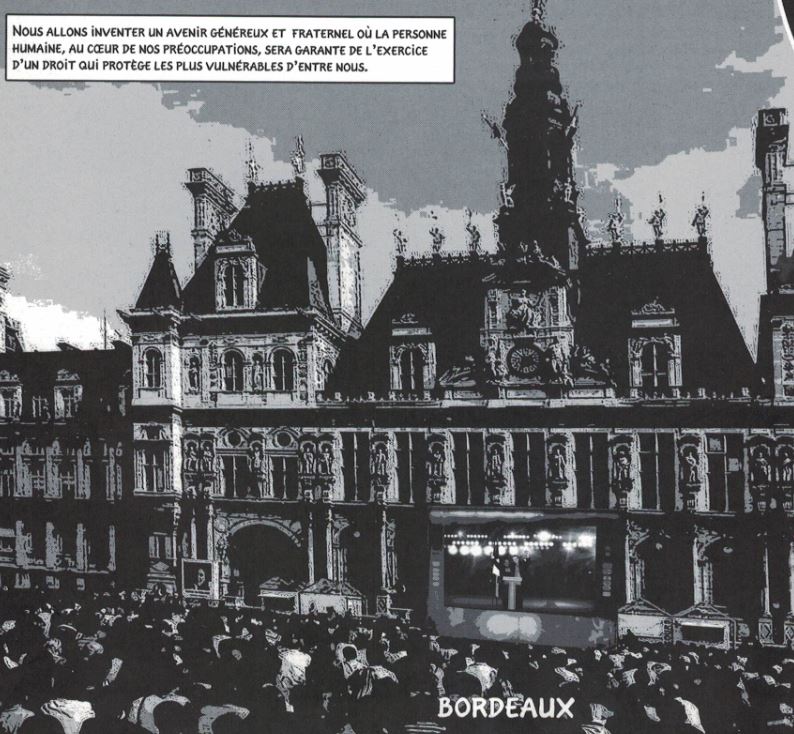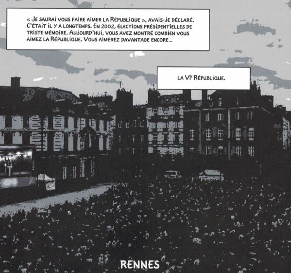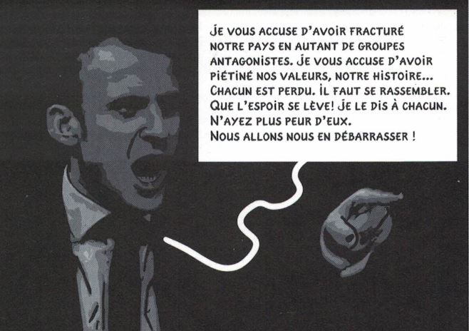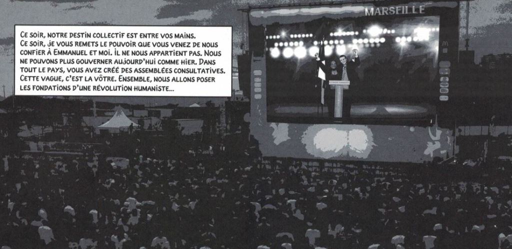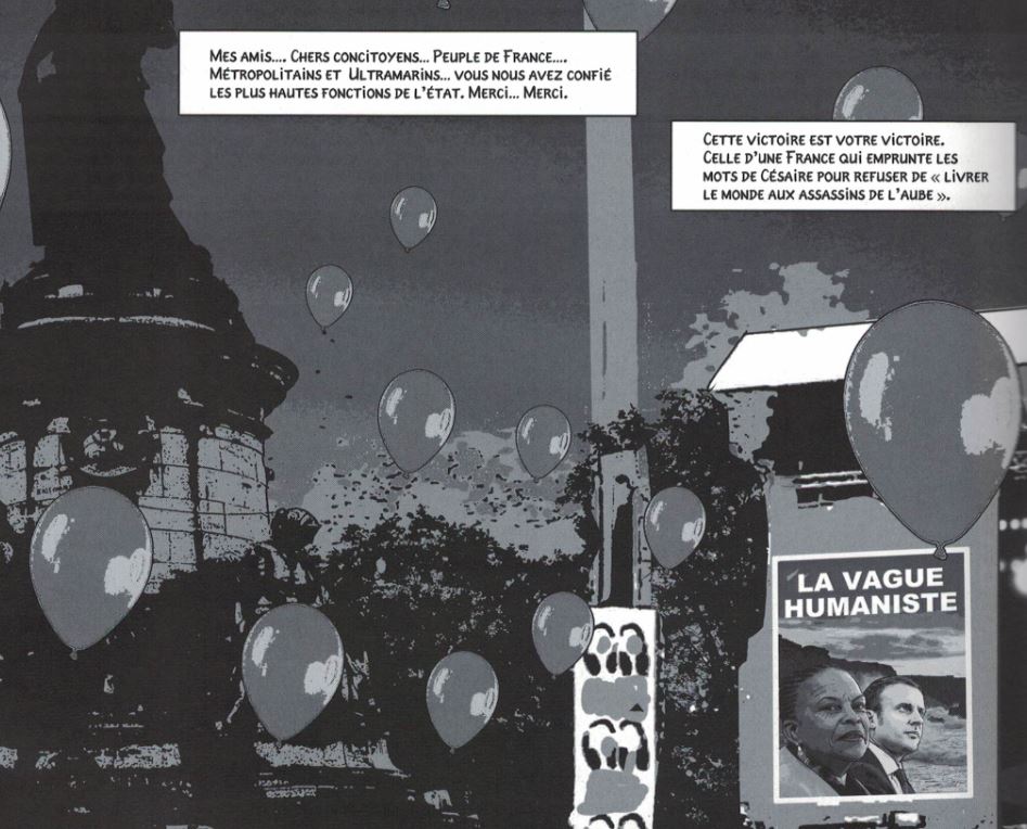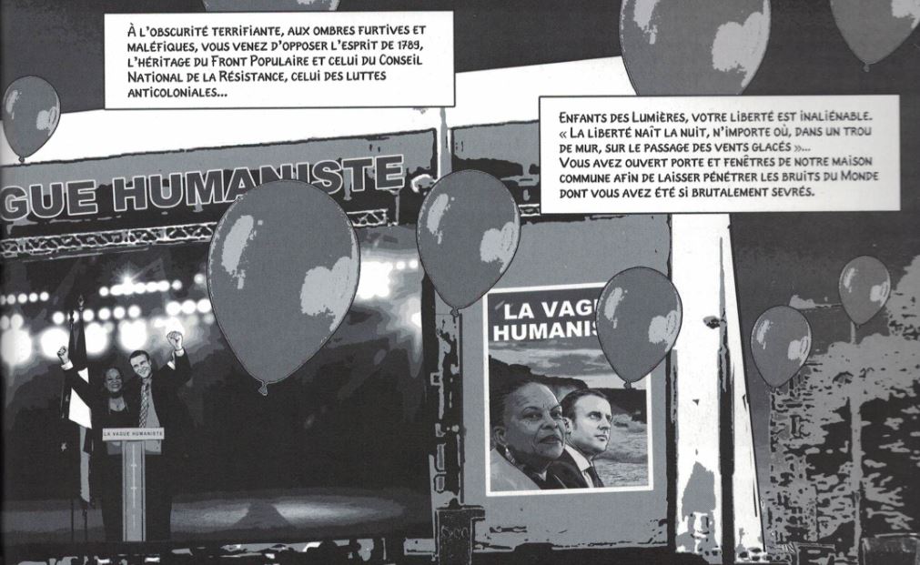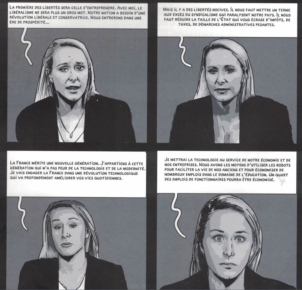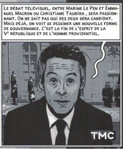 Bon. En 2015, c’était excusable. Il aurait pu, et dû, s’arrêter là. Sa bande dessinée aurait contribué à ce sinistre « front républicain » dont on nous a rebattu les oreilles avant, puis après, le 23 avril 2017. Mais il poursuit sa leçon de « science-fiction civique », en octobre 2016[ii], puis mars 2017[iii], sans tenir compte de ce qui se passait sous ses yeux.