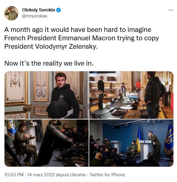 Il y a un mois, on aurait eu du mal à imaginer le président Emmanuel Macron s’efforçant de copier le président Volodymyr Zelensky. Telle est la réalité dans laquelle nous vivons aujourd’hui.”
