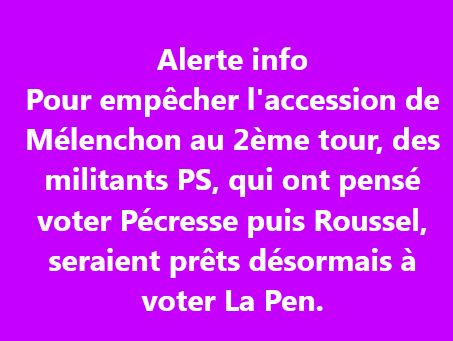 Les directions de l’un et l’autre le savent. Leur seul but est de sauver leurs appareils et leurs bureaucrates : leurs identités et leurs histoires, diront-elles. C’est pourquoi elles prétendent, pour « se reconstruire », enjamber cette nouvelle élection et se limiter à faire voter Macron, pour faire barrage à La Pen, au second tour. Leur seul ennemi véritable est Mélenchon. Ils tentent donc de faire barrage contre lui dès le premier tour. S’ils sont conséquents, les bureaucrates du PS, voyant leur candidate se noyer, voteront Le Pen pour assurer sa présence au second tour.